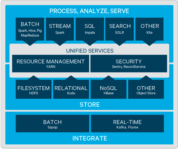 CDH ( pour Cloudera Distributed Hadoop ) est une distribution complète, testée et populaire d'Apache Hadoop et des projets associés. CDH livre les éléments de base de Hadoop - stockage évolutif et calcul distribué - ainsi qu'une interface utilisateur Web et capacités d'entreprise vitales. CDH est une solution Open Source sous licence Apache et est la seule solution Hadoop à offrir un lot unifié de traitement, recherche interactive SQL et interactive, et contrôle d'accès basé sur les rôles.