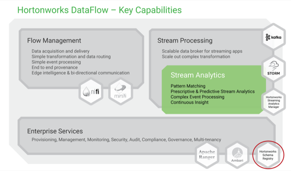 Comme le montre le diagramme ci-dessous, Hortonworks Schema Registry fait partie des services d'entreprise qui alimentent la plate-forme HDF.