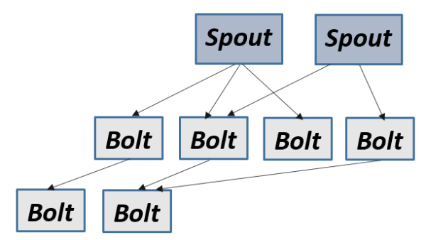 - Les bolts (boulons, en français), sont des « transformateurs » mono-étapes de flux. Ils créent de nouveaux flux en fonction des flux d’entrée. Lorsqu’une transformation nécessite plusieurs étapes, alors autant de bolts que d’étapes sont utilisés. Les types de transformation sont variées (filtrages, agrégations, jointures, tris,…).