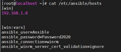 ansible_user=Ansible #Utilisateur créé precedement dans le groupe Administrator de notre serveur Windows ansible_password=Password2020 #Mot de passe du user ansible_connection=winrm #Protocole utilisé par Ansible pour communiquer avec les serveurs Windows ansible_winrm_server_cert_validation=ignore
