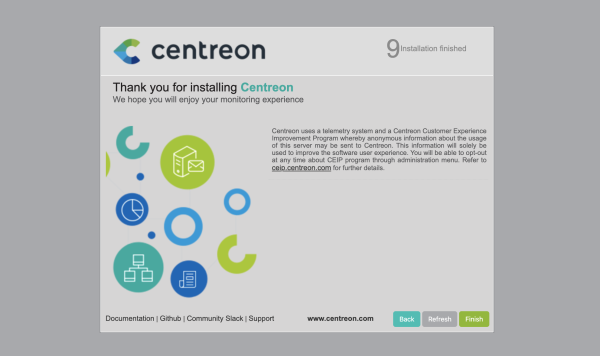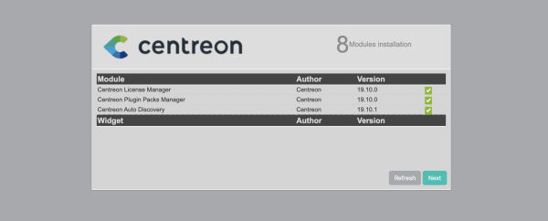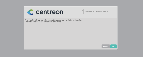 Connectez-vous à l’interface web via http://[ADRESSE_IP_DE_VOTRE_SERVEUR]/centreon. L’assistant de configuration de Centreon s’affiche, cliquez sur Next.