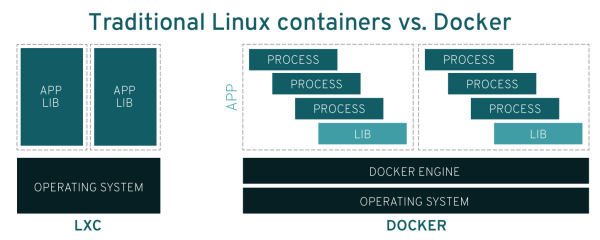 Les conteneurs Linux traditionnels utilisent un système init capable de gérer plusieurs processus. Ainsi, des applications entières peuvent s'exécuter comme un bloc. La technologie Docker encourage la décomposition des applications en processus distincts et fournit les outils nécessaires. Cette approche granulaire présente bien des avantages.