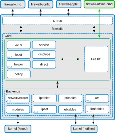 - L'interface D-Bus de Firewalld est le principal moyen de modifier et de créer la configuration du pare-feu. L'interface est utilisée par tous les outils en ligne fournis par firewalld, comme par exemple firewall-cmd, firewall-config et firewall-applet. firewall-offline-cmd ne parle pas à firewalld, mais modifie et crée les fichiers de configuration de firewalld directement en utilisant le noyau de ce dernier avec les gestionnaires d'E/S. firewall-offline-cmd peut être utilisé lorsque firewalld est en cours d'exécution, mais il n'est pas recommandé car il ne peut modifier la configuration permanente qui est visible dans le firewall qu'après environ cinq secondes.