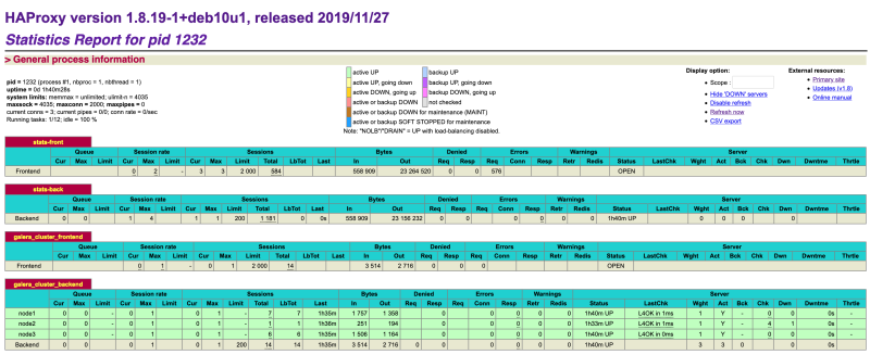 [root@srv ]# nano /etc/haproxy/haproxy.cfg ... # Load Balancing stats frontend stats-front bind *:8282 mode http default_backend stats-back backend stats-back mode http option httpchk balance roundrobin stats uri / stats auth admin:secret stats refresh 10s # Load Balancing for Galera Cluster frontend galera_cluster_frontend bind *:3306 mode tcp option tcplog default_backend galera_cluster_backend # Galera Cluster Backend configuration backend galera_cluster_backend mode tcp option tcpka balance leastconn server node1 192.168.1.2:3306 check weight 1 server node2 192.168.1.3:3306 check weight 1 server node3 192.168.1.4:3306 check weight 1