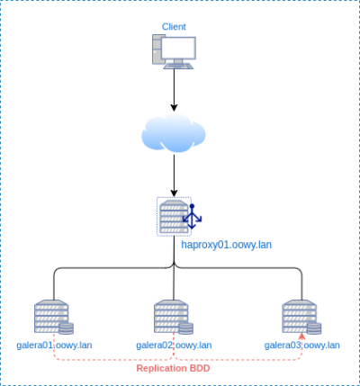 Dans cette configuration tous les requêtes seront envoyées sur 192.168.1.1 qui les transmettra sur les 3 nœuds MariaDB. Pour l'installation d'un cluster MariaDB Galera.