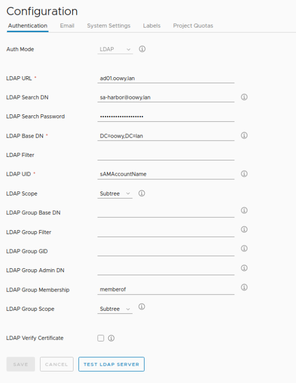 Accédez maintenant au tableau de bord d'administration de Harbor et accédez à Administration > Configuration > Authentification