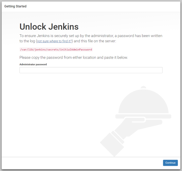 Suivez les instruction de configuration de démarrage de Jenkins. Jenkins veut juste s’assurer qu’il s’agit bien d’un administrateur de la plateforme. Suivez les instructions. Copiez et collez le mot de passe comme indiqué.