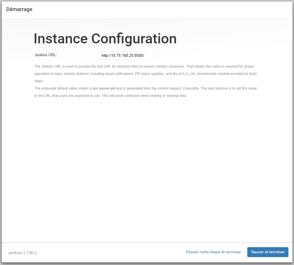 Jenkins vous propose de configurer une instance pour terminer l’installation. Ici vous êtes libre de modifier le port et mettre un port à votre convenance.