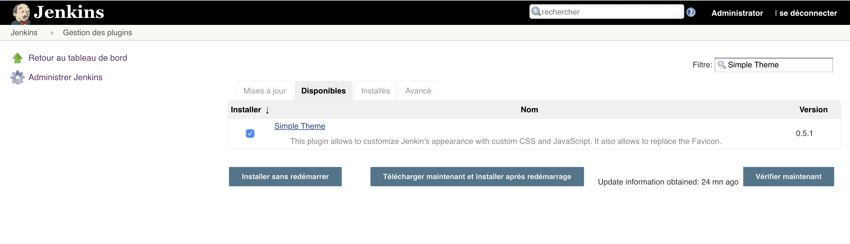 Installation du plugin “Simple Theme” Manage Jenkins > Manage Plugins