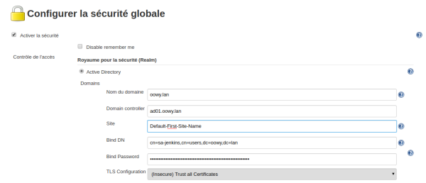 Une fois le plugin installé, il nous suffira de nous rendre dans “Manage Jenkins” > “Configure Global Security” > “Security Realm” de sélectionner “Active Directory” et de renseigner les paramètres de connexion à notre Active Directory.