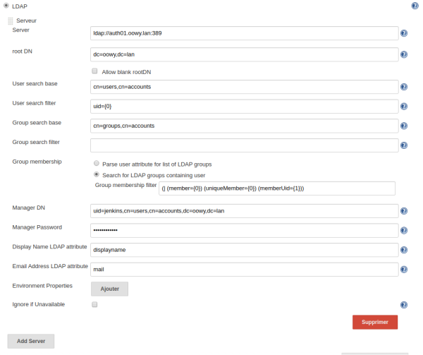 Il nous suffira de nous rendre dans “Manage Jenkins” > “Configure Global Security” > “Security Realm” : de sélectionner “LDAP” et de renseigner les paramètres de la plateforme FreeIPA.