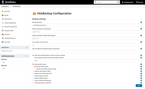 Jenkins ThinBackup est un plugin populaire pour sauvegarder Jenkins. Il sauvegarde toutes les données en fonction de votre planning et gère également la rétention des sauvegardes.
