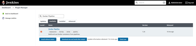 Dans Manage Jenkins > Manage plugins > Available rechercher Docker Pipeline.