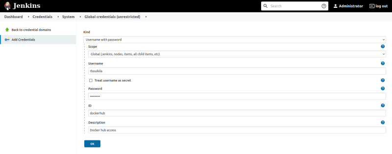 Nous allons déclarer nos accès à dockerHub dans “Manage Jenkins” > “Manage Credentials” > “Add Credentials”