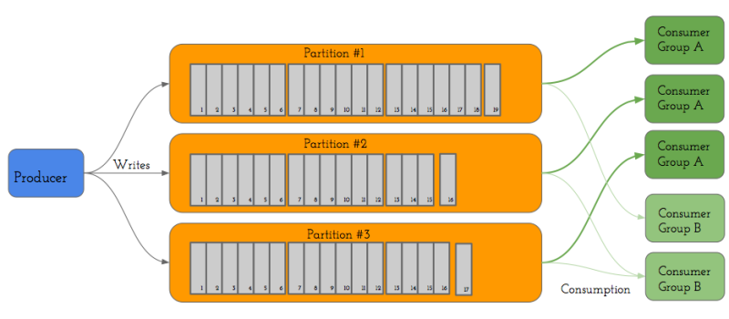 Afin de limiter la contention lors des actions d’écriture et de lecture, un topic est décomposé en partitions assurant un maximum de parallélisme. Le nombre maximum de consommateur agissant en simultané est directement corrélé au maximum de partitions configurées.