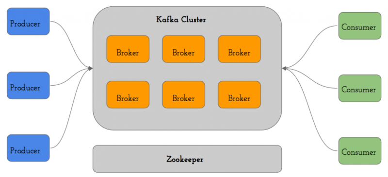 Kafka a proprement parlé est composé de Brokers et de Zookeeper. Les brokers servent de pivot entre les différents services. Ils sauvegardent les données qui transitent, tout en assurant une redondance des données afin d’avoir une forte tolérance aux pannes. Zookeeper, quant à lui, assure la gestion de la configuration distribuée, ainsi que la coordination des brokers et le suivi de l’état des services gravitants autour de Kafka.