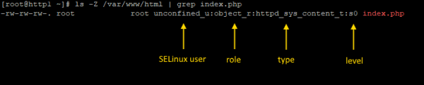 $ ls -alZ /var/www/ drwxr-xr-x. root root system_u:object_r:httpd_sys_content_t:s0 . drwxr-xr-x. root root system_u:object_r:var_t:s0 .. drwxr-xr-x. root root system_u:object_r:httpd_sys_script_exec_t:s0 cgi-bin drwxr-xr-x. root root system_u:object_r:httpd_sys_content_t:s0 html