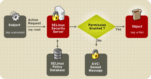 Lorsqu'un sujet (une application ou un processus) envoie une requête pour accéder à un objet (par exemple un fichier), SELinux consulte un cache AVC (Access Vector Cache) où sont temporairement stockées les autorisations d'accès pour les différents sujets et objets.
