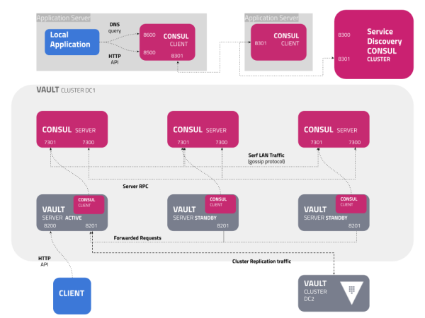 Celui-ci va dispatcher les flux entrant vers le premier server Vault. En cas de non disponibilitée, les flux seront transférés vers le serveur Vault secondaire qui se chargera ensuite de traiter la demande.