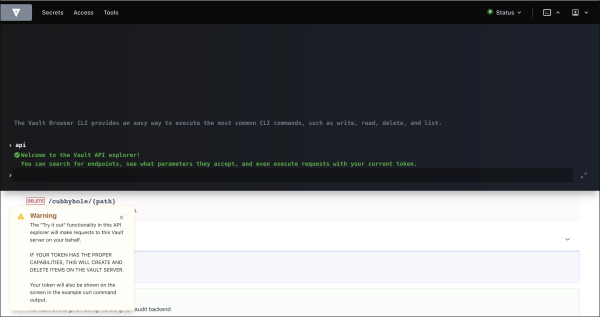 The “Try it out” functionality in this API explorer will make requests to this Vault server on your behalf. IF YOUR TOKEN HAS THE PROPER CAPABILITIES, THIS WILL CREATE AND DELETE ITEMS ON THE VAULT SERVER. Your token will also be shown on the screen in the example curl command output.