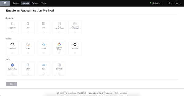 Vous pouvez configurer les Auth Methodes pour assigner automatiquement un ensemble de stratégies aux jetons créés en vous authentifiant avec. La façon dont cela se fait diffère selon la méthode d’autorisation connexe, mais implique généralement de mapper un rôle à des politiques ou de mapper des identités ou des groupes à des politiques.