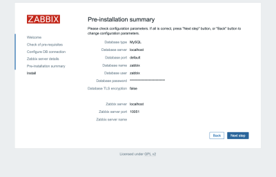 Vous avez parlé de votre base de données au serveur Zabbix, mais l'interface web Zabbix a également besoin d'un accès à la base de données pour gérer les hôtes et lire les données. Saisissez donc les identifiants MySQL que vous avez configurés à l'étape 2. Cliquez sur Next step pour continuer.
