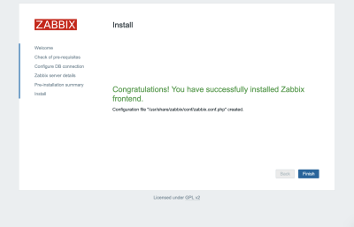 La configuration de l'interface web est maintenant terminée. Ce processus crée le fichier de configuration /usr/share/zabbix/conf/zabbix.conf.php, que vous pouvez sauvegarder et utiliser à l'avenir.