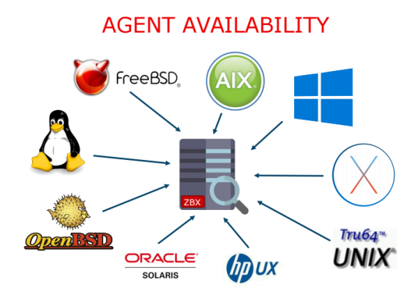 L'agent rassemble les informations opérationnelles localement et transmet les données au serveur Zabbix pour un traitement ultérieur. En cas d'échec (par exemple, un disque dur plein ou un service en panne), le serveur Zabbix peut alerter activement les administrateurs de la machine particulière qui a signalé la panne.