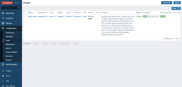 Lorsque vous vous êtes connecté, cliquez sur Configuration et ensuite sur Hosts dans la barre de navigation de gauche. Cliquez ensuite sur le bouton Create host dans le coin supérieur droit de l'écran.