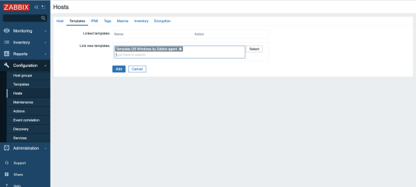 Tapez Template OS Windows by Zabbix agent dans le champ Search, puis sélectionnez-le dans la liste pour ajouter ce modèle à l'hôte.