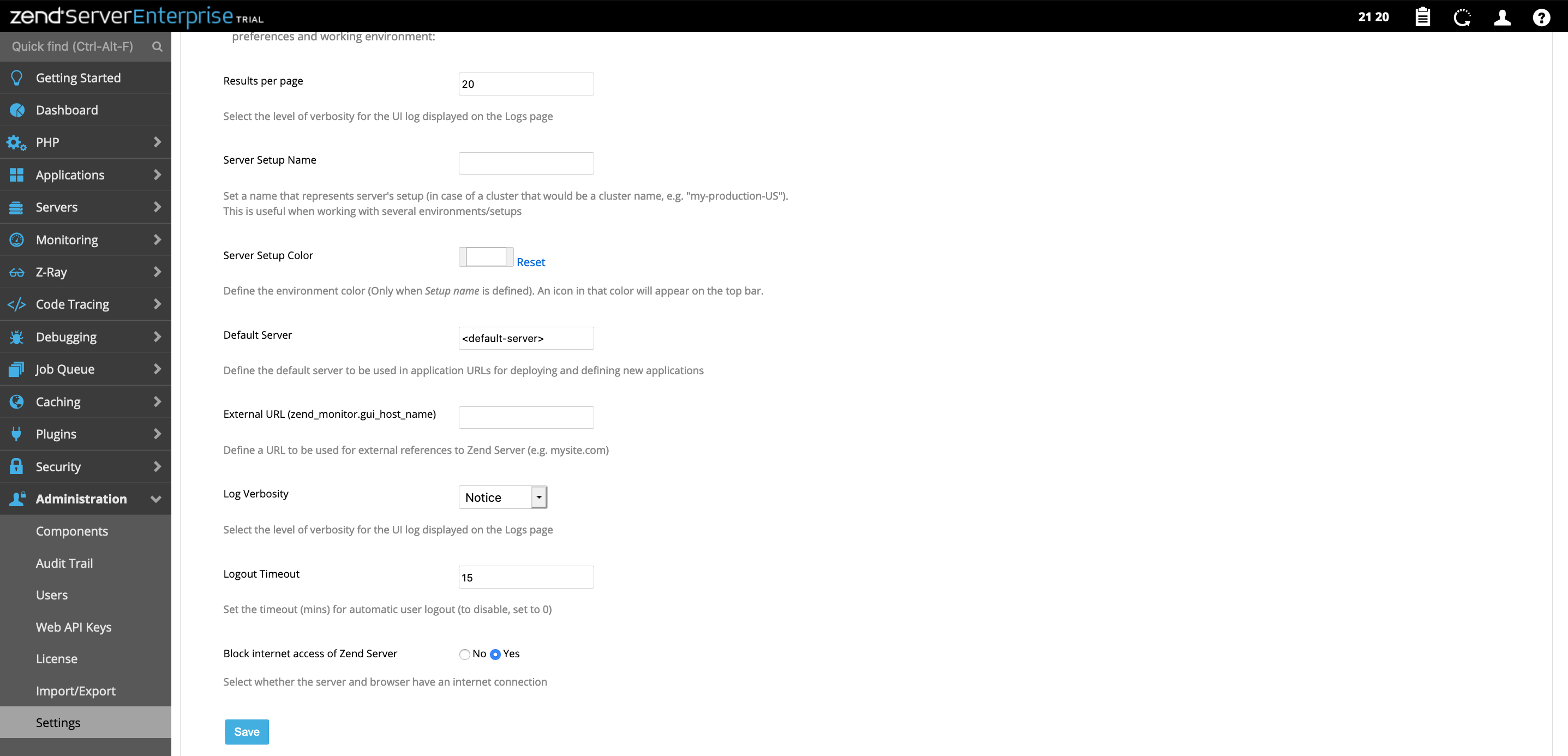 Dans Administration > Settings et activer l'option “Block internet access of Zend Server”