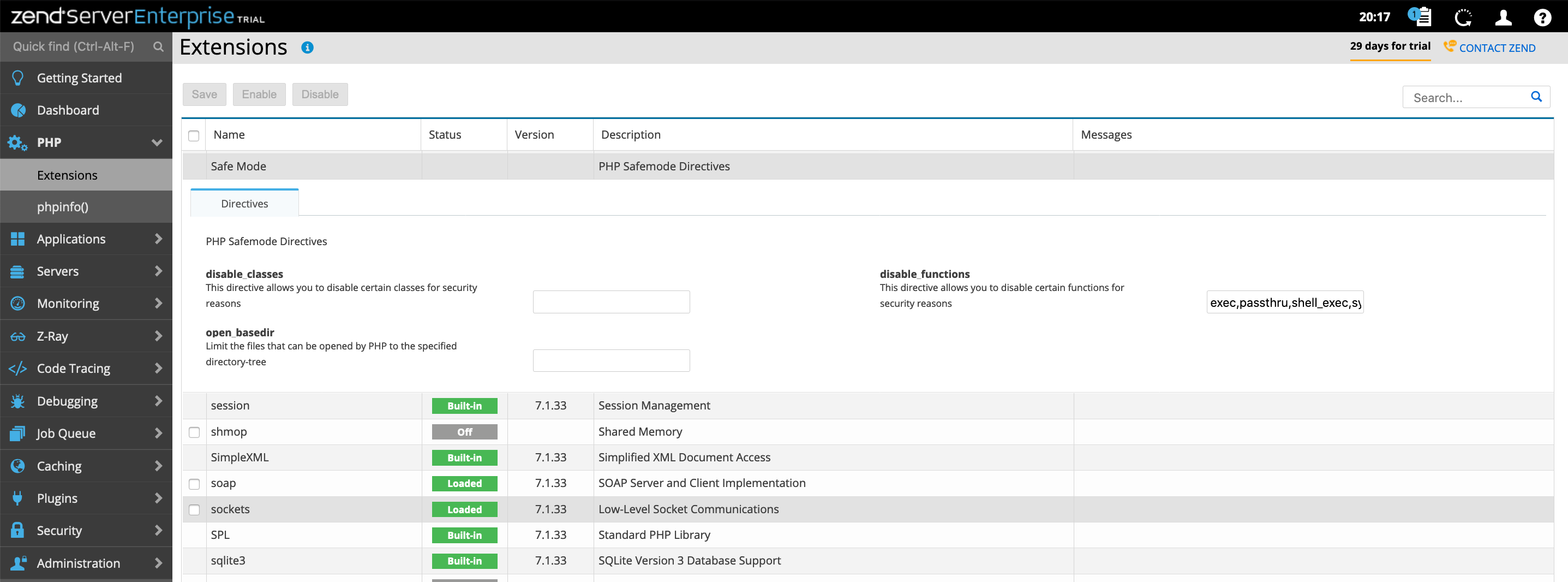 Chercher “Safe Mode” et dans “disable_functions” ajouter les fonctions suivantes : exec,passthru,shell_exec,system,proc_open,popen,curl_exec,curl_multi_exec,parse_ini_file,show_source