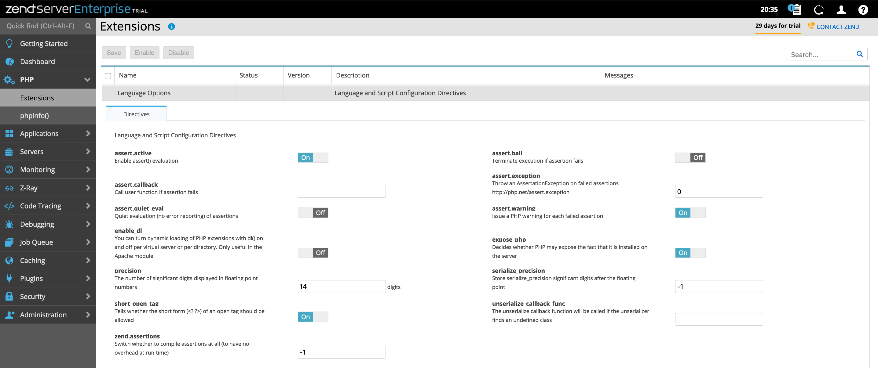 Toutes les configurations de PHP devrons êtres réalisées depuis la Web UI de Zend Server.