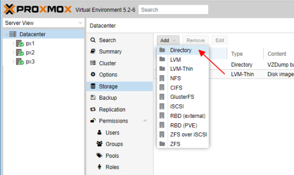 Sélectionnez le type de stockage que vous souhaitez ajouter au cluster (ici “Directory”).