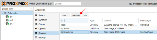 root@px1:~# pvesh set /storage/local-volume -content=images,vztmpl,rootdir 200 OK